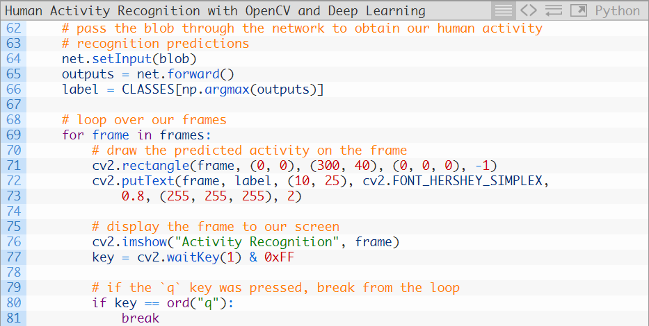 第64和65行将blob通过网络,获得输出列表(预测结果)。随后我们选取最高的预测结果作为这个blob的标签(第66行)。利用这个标签,我们可以抽取出帧图像列表中每个帧图像的预测结果(69-73行),显示输出帧图像,直到按下q键时就打破循环并退出。一个利用双队列(Deque)数据结构的人类活动实现的替代品