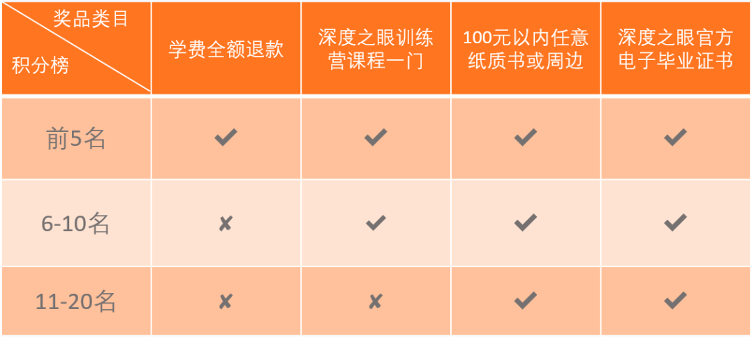 按学习任务要求完成全勤打卡且排名前20的同学,我们将赠送你深度之眼定制周边福利!