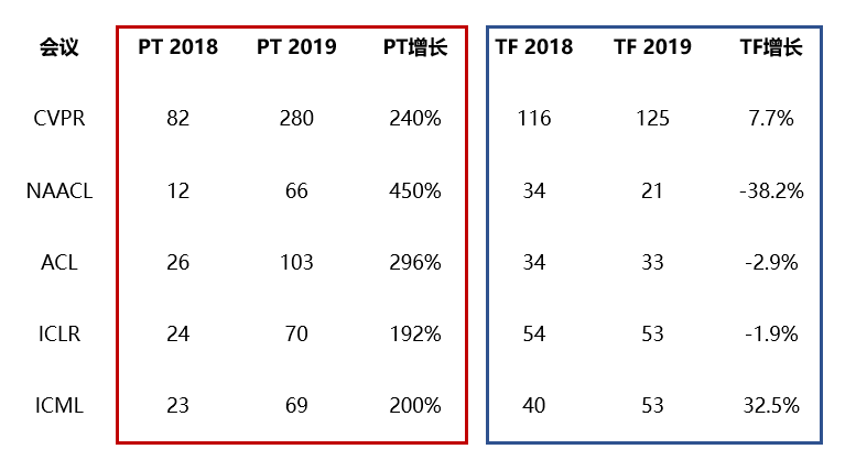 从上图数据可以直观的看出:PyTorch只用了一年,便把弱势变成了压倒性优势。