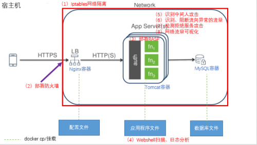 部署软WAF,通过在Docker网络集群的流量入口处做软WAF的部署(形态可以是宿主机软件或者Docker容器),可以在此处阻断、发现部分恶意流量。
