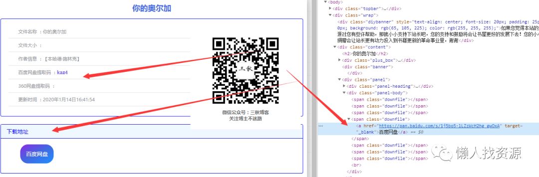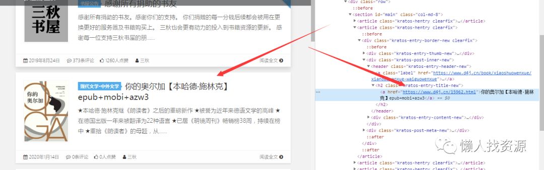 最近懒人星球也有群友分享了很多投资入门的,感兴趣的群友自行去查看下载。后面的心理科学主题,医学养生主题,因为幕布分享的次数限制,就不在今天的推文贴二维码了,明天也会把完整的目录链接放在懒人盘对应主题下面。166本心理类+108医学养生类书籍,等你发现~晚点有时间再多加点主题,比如英文原版书。整理好辛苦,希望大家受益哈哈。最初的想法是利用幕布,直接把网盘链接放在标题下面,这样方便大家查阅存储和分享,可是幕布不支持标识符分级,手动加又费时间。所以只在幕布放目录,在懒人盘放云盘了。三秋书屋(https://www.d4j.cn/)这个网站挺良心的,大家有能力的可以去打赏支持,而且网站的文章还有内容介绍啊这些。原本要贴源码教大家怎么爬它的,但担心给人家服务器造成负担,这里只聊一下思路。利用BeautifulSoup解析完selector筛选器抽出链接,链接在href下,利用get("href")抽出。上面三个步骤用三个函数写完,嵌套在一起就能实现网盘链接获取。在构造页码循环就能批量获取链接。可以打印也可以存到数据库中。上面是思路会不会有点绕。这样,给出第一个函数代码,利用它可以爬文章详情页链接。