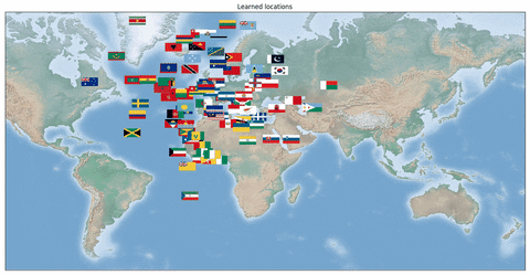 在下面的动画中,也可以看到神经网络训练期间各国首都在全球范围内的位置。