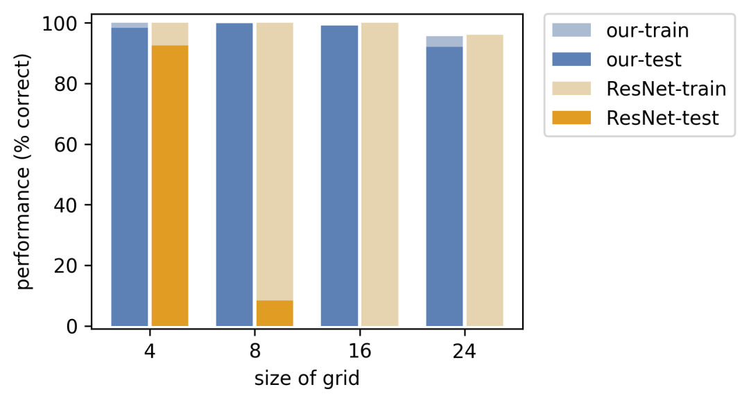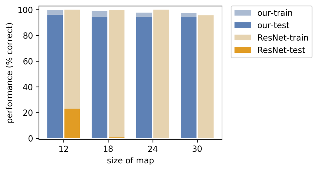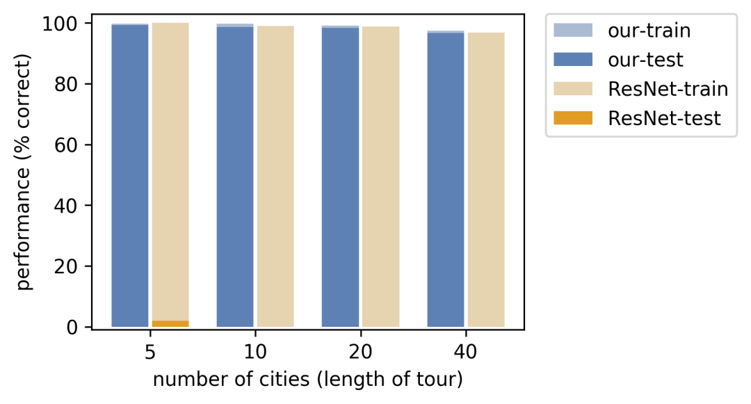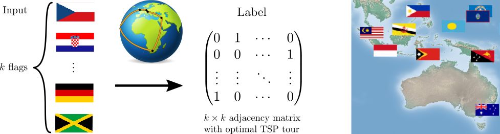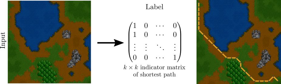 计算插值梯度的计算开销取决于求解器,额外的开销有两次,一次是在前向传播过程中调用的一次求解器,另一次是在后向传播过程中调用的一次求解器。为了验证该方法,设计了具有一定程度复杂度的合成任务进行验证。另外,因为简单的监督学习方法无法泛化至没有见过的数据,所以在下面的任务中,已经证明了此方法对于组合泛化的必要性。对于最短路径问题,测试任务为魔兽争霸,训练集包括《魔兽争霸 II》地图,任务目标为地图对应的最短路径问题。具体而言,测试集包含了未知的《魔兽争霸 II》地图。地图本身编码为K*K网格。卷积神经网络的输入是地图,输出地图是顶点的损失,然后将该损失作为求解器的输入。最后,求解器(Dijkstra 最短路径算法)以指示矩阵的形式在地图上输出最短路径。在训练的开始,神经网络不知道如何为地图的图块分配正确的损失,但是使用组合求解器+深度学习能够得到正确的成本,从而找到正确的最短路径。下列直方图表明,相比于 ResNet 的传统监督训练方法,此方法的组合泛化能力更棒。在最小损失完美匹配问题上,使用的数据集是MNIST,任务目标是输出 MNIST 数字组成网格的最小损失完美匹配。具体而言,在此问题上,选择的边应该让所有的顶点都能够恰好被包含一次,另外还能够让损失之和最小。另外,网格中的每个单元都包含一个 MNIST 数字,该数字是图中具备垂直和水平方向邻近点的一个节点。最后,边的损失由垂直向下或水平向右的两位数字决定。求解器输出匹配中所选边的指示向量。右侧的匹配损失为 348(水平为 46 + 12,垂直为 27 + 45 + 40 + 67 + 78 + 33)。在下面这张性能图上,我们可以清晰看到在神经网络中嵌入真实的完美匹配求解器能够达到更好的效果。在旅行商问题中,训练数据集是国旗(即原始表示)和对应首都的最优旅行线路。神经网络的输出是各个国家首都的最佳旅行线路。神经网络在训练的过程,最重要的学习首都位置的隐表示。包含K个国家的训练示例如下图所示。