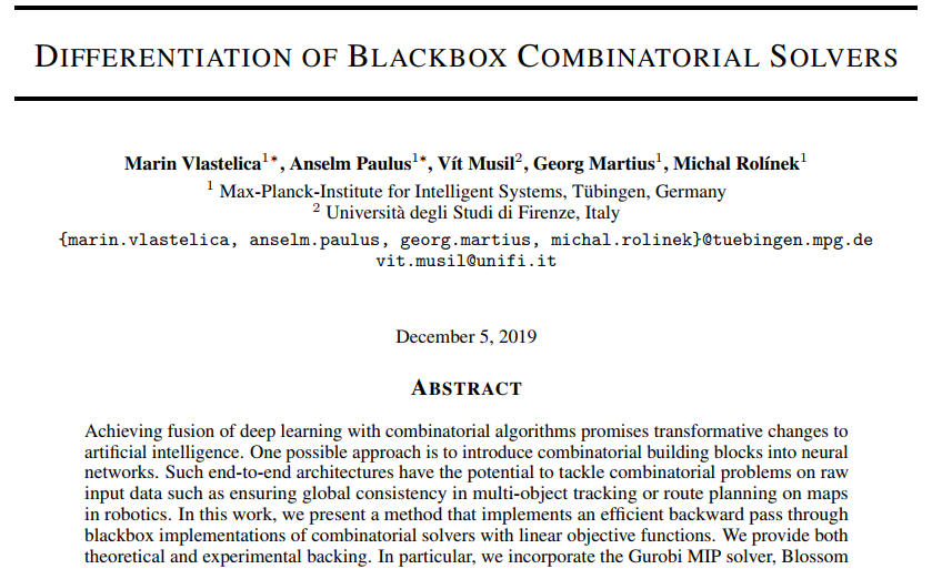 起初,位置是随机分布的,但经过训练后,神经网络不仅学习输出正确的TSP旅行线路,而且学习输出正确的表示,即各个首都的正确3D坐标。值得注意的是,这仅仅是通过在监督训练过程中使用 Hamming 距离损失,以及对网络输出使用 Gurobi 中的 MIP 实现的。实际上,已经证明在求解器损失函数的某些假设下,可以通过黑盒组合求解器传播梯度。这能够让传统有监督方法的标准神经网络架构实现的组合泛化能力。深度学习+组合求解器的学习方法能够在一些需要组合推理的现实问题上得到广泛的应用。然而问题在于求解器损失的线性这一假设前提上,在此假设下我们究竟可以走多远?未来工作的重点以及问题在于我们能否学习到组合问题的潜在约束,例如 MIP 组合问题。Vlastelica, Marin, et al. “Differentiation of Blackbox Combinatorial Solvers” arXiv preprint arXiv:1912.02175 (2019). (http://bit.ly/35IowfE)Rolínek, Michal, et al. “Optimizing Rank-based Metrics with Blackbox Differentiation.” arXiv preprint arXiv:1912.03500 (2019). (http://bit.ly/35EXIMN)https://towardsdatascience.com/the-fusion-of-deep-learning-and-combinatorics-4d0112a74fa7