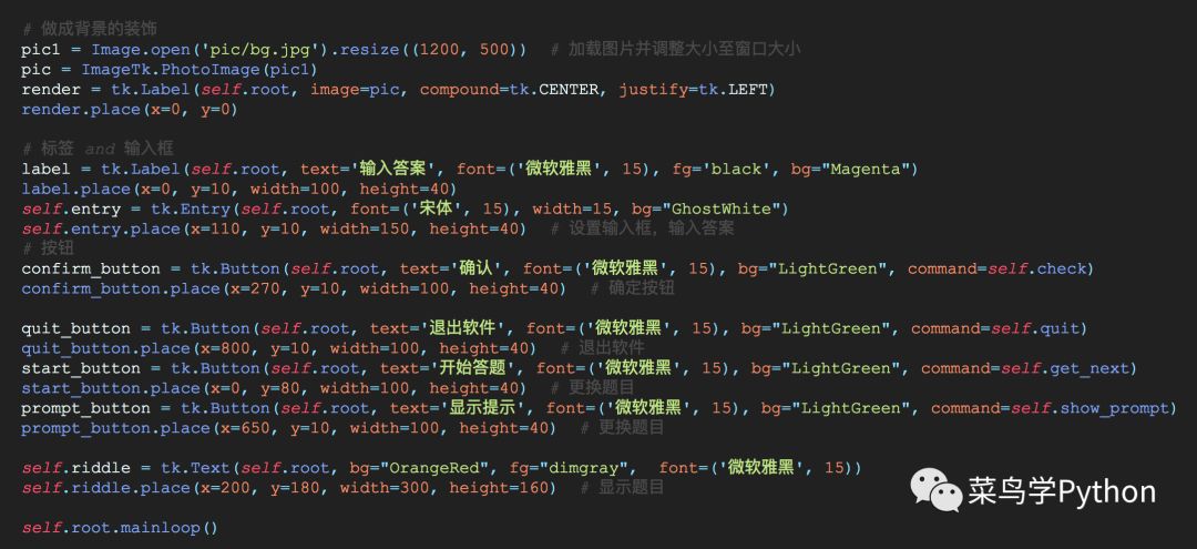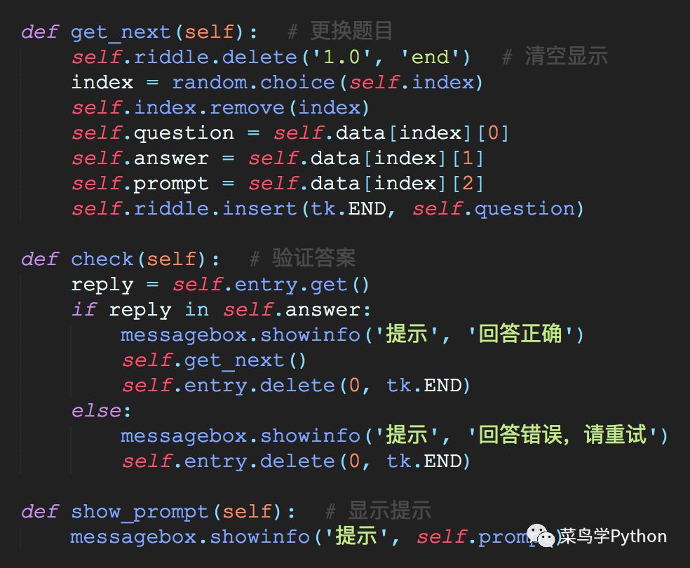 程序中显示的分别是 “更换题目”、“验证答案” 和 “显示提示” 的程序,更换题目程序中,程序随机从总的谜题中挑选一个谜题,同时将该谜题删除,防止该谜题被重复采用。