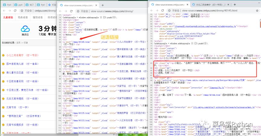 由于网页爬取并没有涉及反爬的措施,因此爬虫的程序设计比较简单,我们首先获取的是每个谜语的页面链接地址,然后在每个谜语链接地址中通过 requests 库请求网页的源代码,并通过 beautifulsoup 库来分析网页源代码来爬取每个谜语的提示、谜面和谜底。