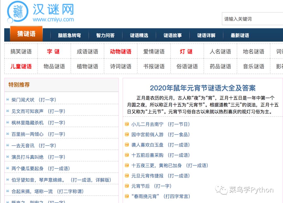 那么怎么获取灯谜数据呢,其实这样的网站有很多,比如这个猜谜语的网站就很不错。