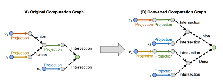 在 Ren 等人的论文「Query2box: Reasoning over Knowledge Graphs in Vector Space Using Box Embeddings」中,建议将查询作为矩形。此方法允许执行自然交叉操作,因为它会生成新的矩形框。但是,对并集进行建模并不是那么简单,因为它可能导致不重叠的区域。此外,为了精确地模拟任何嵌入的查询,由 VC 维度测量的嵌入之间的距离函数的复杂性应该与图中实体的数量成正比。相反,有一个很好的技巧可以将析取查询替换为 DNF 形式,其中联合只发生在计算图的末尾,这有效地减少了到每个子查询的简单距离计算。