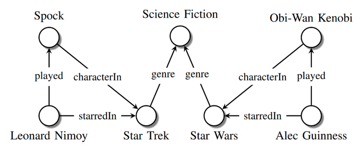 今年有不少关于知识图谱推理的论文。从本质上讲,知识图谱是表示事实的结构化方法。与一般图不同,在知识图谱中,节点和边实际上具有一些含义,如演员的名字或电影中的表演(见下图)。知识图谱上的一个常见问题是回答复杂的问题,例如「2000 年前 Steven Spielberg 的哪部电影获得了奥斯卡奖?」可以转换为逻辑查询「{Win(Oscar,V)∧Directed(Spielberg,V)∧ProducedBefore(2000,V)}」。