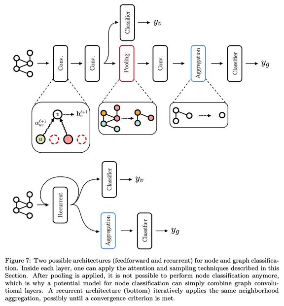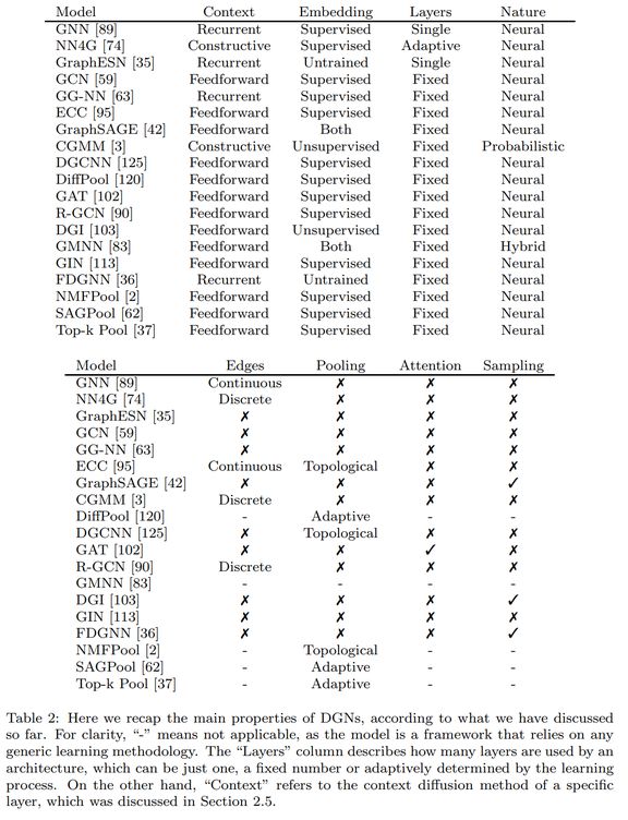 下图 7 展示了如何排列和结合不同的构造块,来构建端到端训练的前馈或循环模型:介绍完主要构造块和生成节点和图表示的常见方法之后,本章将讨论待解决的不同学习任务,主要涉及无监督、监督、生成和对抗学习任务,从而为该领域的研究提供综述。表 2 依据四个核心属性区分各个模型,这四个属性分别是:语境散布方法、嵌入计算方法、层的构建方法,以及模型的本质属性(神经/概率/混合)。然后,作者添加了一些其他属性,如处理边的能力、执行池化的能力、注意邻域的能力,以及对邻域采样的能力。还有一些方法和主题暂未包含在上文分类中,本文主要关注基于局部和迭代处理的图深度学习方法。为完整概述该领域的发展,本章将简要概述上文未包含的一些主题: