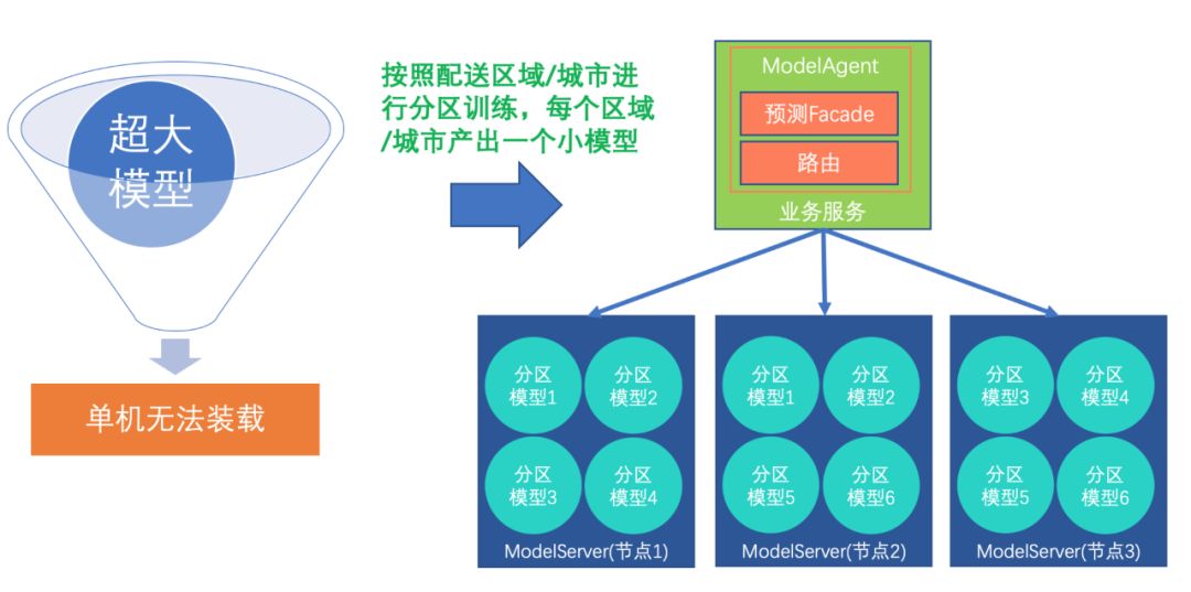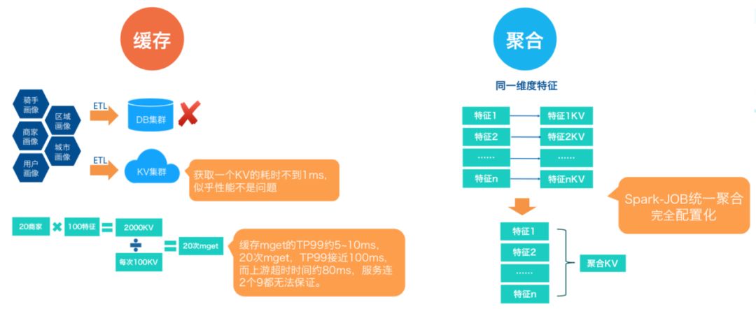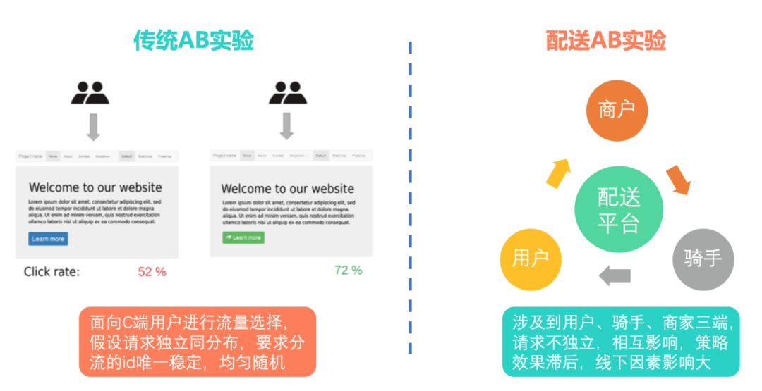 对于超大规模模型,单机无法装载,需要对模型进行Sharding。鉴于美团配送的业务特性,可以按照配送城市/区域进行分区训练,每个城市或区域产出一个小模型,多个分区模型分散部署到多个节点上,解决单节点无法装载大模型的问题。分区模型要求我们必须提供模型的路由功能,以便业务方精准地找到部署相应分区模型的节点。同时,模型管理平台还收集各个服务节点的心跳上报信息,维护模型的状态和版本切换,确保所有节点上模型版本一致。配送线上业务每天会记录许多骑手、商家、用户等维度的数据,这些数据经过ETL处理得到所谓的离线特征,算法同学利用这些离线特征训练模型,并在线上利用这些特征进行模型在线预测。离线特征平台就是将存放在Hive表中的离线特征数据生产到线上,对外提供在线获取离线特征的服务能力,支撑配送各个业务高并发及算法快速迭代。最简单的方案,直接把离线特征存储到DB中,线上服务直接读取DB获取特征Value。读取DB是个很重的操作,这种方案明显不能满足互联网大并发的场景,直接被Pass掉。第二种方案,把各个离线特征作为K-V结构存储到Redis中,线上服务直接根据特征Key读取Redis获取特征Value。此方案利用了Redis内存K-V数据库的高性能,乍一看去,好像可以满足业务的需求,但实际使用时,也存在着严重的性能问题。典型的业务场景:比如我们要预测20个商家的配送时长,假设每个商家需要100个特征,则我们就需要20*100=2000个特征进行模型计算,2000个KV。如果直接单个获取,满足不了业务方的性能需求;如果使用Redis提供的批量接口Mget,如果每次获取100个KV,则需要20次Mget。缓存mget的耗时TP99约5ms,20次Mget,TP99接近100ms,也无法满足业务方的性能需求(上游服务超时时间约50ms)。因此,我们需要对离线特征从存储和获取进行优化。我们提出了特征组的概念,同一维度的特征,按照特征组的结构进行聚合成一个KV,大大减少了Key的数目;并且提供了相对完善的管理功能,支持对特征组的动态调整(组装、拆分等)。相比于传统配送,即时配送无论是在位置信息、骑手负载,还是在当前路网情况,以及商家出餐情况等方面都是瞬息变化的,实时性要求非常高。为了让机器学习算法能够即时的在线上生效,我们需要实时地收集线上各种业务数据,进行计算,提炼成算法所需要的特征,并实时更新。AB实验并不是个新兴的概念,自2000年谷歌工程师将这一方法应用在互联网产品以来,AB实验在国内外越来越普及,已成为互联网产品运营精细度的重要体现。简单来说,AB实验在产品优化中的应用方法是:在产品正式迭代发版之前,为同一个目标制定两个(或以上)方案,将用户流量对应分成几组,在保证每组用户特征相同的前提下,让用户分别看到不同的方案设计,根据几组用户的真实数据反馈,科学的帮助产品进行决策。 互联网领域常见的AB实验,大多是面向C端用户进行流量选择,比如基于注册用户的UID或者用户的设备标识(移动用户IMEI号/PC用户Cookie)进行随机或者哈希计算后分流。此类方案广泛应用于搜索、推荐、广告等领域,体现出千人千面个性化的特点。此类方案的特点是实现简单,假设请求独立同分布,流量之间独立决策,互不干扰。此类AB实验之所以能够这样做是因为:C端流量比较大,样本足够多,而且不同用户之间没有相互干扰,只要分流时足够随机,即基本可以保证请求独立同分布。即时配送领域的AB实验是围绕用户、商户、骑手三者进行,用户/商户/骑手之间不再是相互独立的,而是相互影响相互制约的。针对此类场景,现有的分流方案会造成不同策略的互相干扰,无法有效地评估各个流量各个策略的优劣。鉴于上述的问题,我们将配送侧的AB实验分为三个阶段:事前的AA分组,事中的AB分流,事后的效果评估。- AA分组:将候选流量按照既定的规则预先分为对照组和实验组,基于数理统计的理论确保对照组和实验组在所关注的业务指标上没有显著差异。