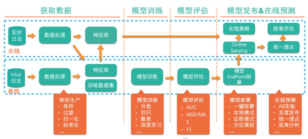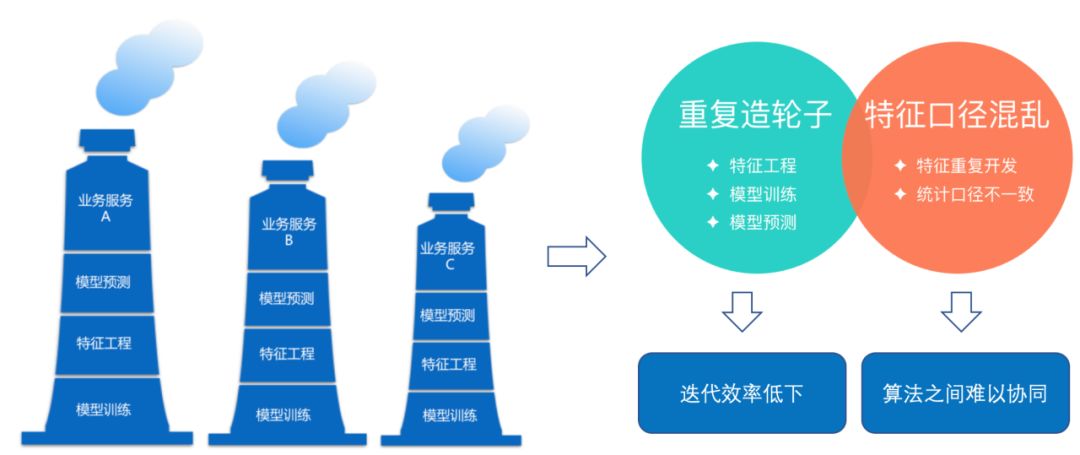 - 重复造轮子:特征工程、模型训练、模型在线预测都是各自研发,从零做起,算法的迭代效率低下。