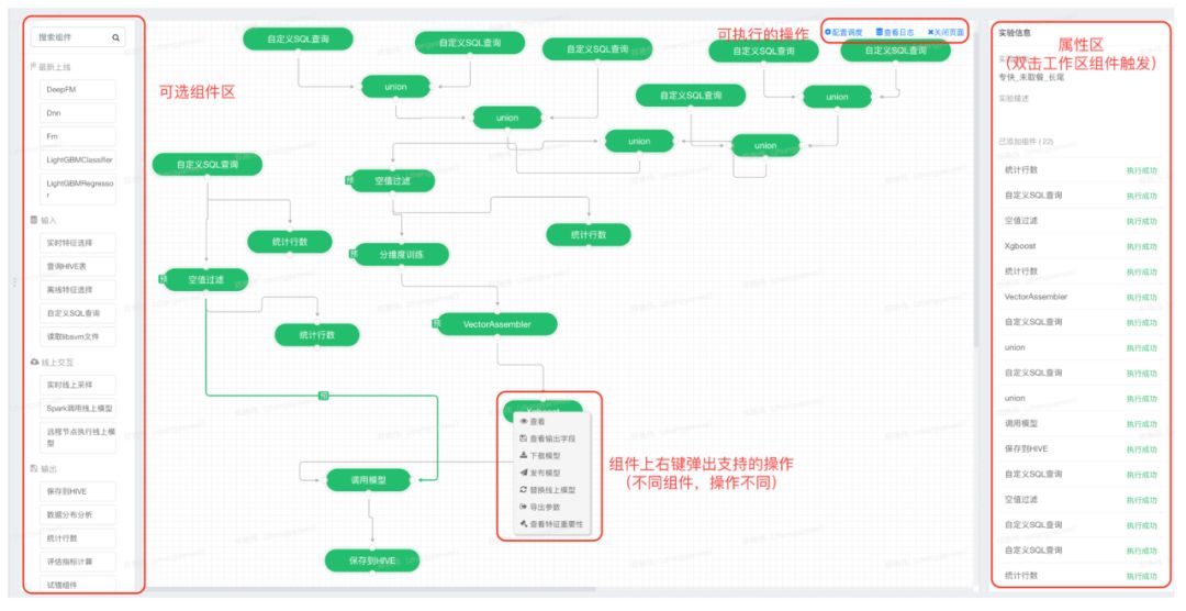 - 通过对Spark ML、XGBoost、TensorFlow机器学习框架的封装,我们实现了可视化离线训练平台,通过拖拉拽的方式生成DAG图,屏蔽多个训练框架的差异,统一模型训练和资源分配,降低了算法RD的接入门槛。