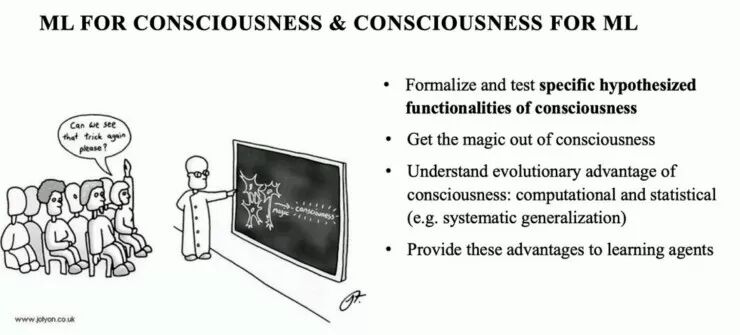 根据 NeurIPS 2019 程序委员会主席 Hugo Larochelle 的分析,接收率最高的论文类别是神经科学。在Yoshua Bengio的演讲「From System 1 Deep Learning to System 2 Deep Learning」和 Blaise Aguera y Arcas的演讲「Social Intelligence」中,他们都敦促机器学习研究社区更多地思考自然智能的生物学根源。Bengio 的演讲将「意识」引入了主流的机器学习词汇体系中。Bengio 提出的「意识」概念的核心是注意力。他将机器注意力机制与我们的大脑选择分配注意力的方式进行了比较:「机器学习可以用来帮助脑科学家更好地理解意识,但我们对意识的理解也可以帮助机器学习发展出更好的能力」。根据 Bengio 的说法,如果我们希望机器学习算法能够泛化到分布之外的样本上,那么受意识启发的方法可能是一种解决方案。图 8:将机器学习用于意识&将意识用于机器学习——(1)形式化定义并测试特定的意识的假设函数(2)揭开意识的神秘面纱(3)从计算和统计的角度(例如,系统的泛化)理解意识演化的优势(4)将这些优势应用于学习智能体。在本届大会上,我最喜欢 Aguera y Arcas 的演讲。他的演讲在理论上非常严谨,但同时也是可行的。他认为通过优化方法不足以获得类似于人类的智力:「优化不是生命体工作的方式,大脑不仅仅是在评估一个函数。它们会发展。它们会自我修正。他们从经验中学习。仅仅通过一个函数并不能包含这些东西」。他呼吁人们研究「一种更通用的、受生物学启发的突触更新规则,它允许使用损失函数和梯度下降法,但并不要求一定要这么做」。NeurIPS 上的这一趋势与我观察到的现象不谋而合:很多人工智能界的研究人员正转而研究神经科学。他们把神经科学重新带回了机器学习领域。