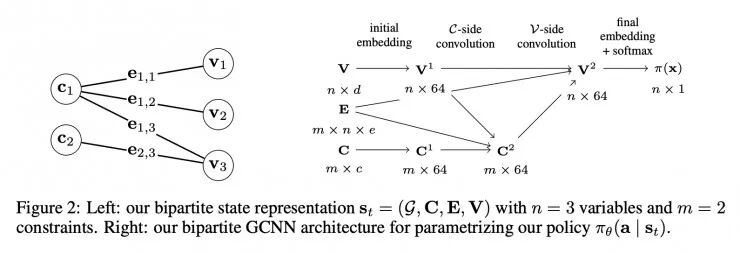 多年来,我经常谈到:图论是在机器学习领域最被低估的课题之一。我很高兴有关图的工作在本届 NeurIPS 上大放异彩。「图表征学习」是本届 NeurIPS 上最受欢迎的研讨会。令人惊讶的是,该领域已经取得了如此大的进步。时间回到 2015 年,当我在实习期间开始研究图神经网络时,我没有想到会有如此多的研究人员参与到这个领域中来。图是适用于许多种数据(例如,社交网络、知识库、游戏的状态)的优雅而自然的表征形式。用于推荐系统的「用户-物品」数据可以被表示为一个二分图,其中一个不相交的集合由用户组成,另一个由物品组成。图也可以表征神经网络的输出。正如 Yoshua Bengio 在他的演讲中提醒人们的那样:任何联合分布都可以通过因子图来表示。这使得图神经网络能够完美地适应组合优化(例如,旅行商问题、任务调度问题)、身份匹配(在这种问题中 Twitter 用户和 Facebook 的用户是一样的吗?)、推荐系统等任务。目前最流行的图神经网络是图卷积神经网络(GCNN),这是意料之中的,因为图和卷积都可以编码局部的信息。卷积以寻找输入中邻近部分之间的关系为目标编码一种偏置。而图通过边对输入中关系最密切的部分进行编码。图 4:(左图)二分图 St=(G,C,E,V)有 n=3 个变量和 m=2 个常量。(右图)用于将策略πθ(a|st)参数化的二分图 GCNN 架构。