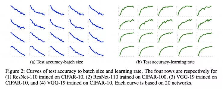 在一篇更为实用的论文「Control Batch Size and Learning Rate to Generalize Well: Theoretical and Empirical Evidence」中,Fengxiang He 和他的团队在 CIFAR 数据集上使用随机梯度下降算法(SGD)训练了 1,600 个 ResNet-110 模型和 VGG-19 模型,发现这些模型的泛化能力与批处理大小呈负相关,与学习率呈正相关,与「批处理大小/学习率」的比值呈负相关。