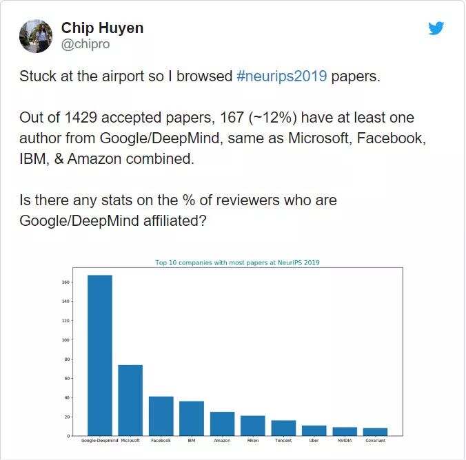 在所有被接收的论文中,有 12% 至少包含一名来自谷歌或 DeepMind 的作者。