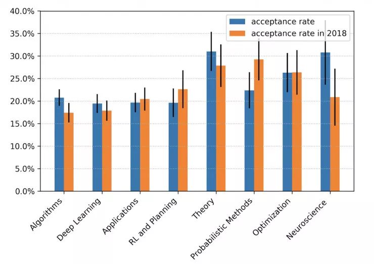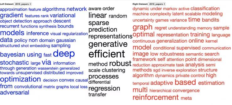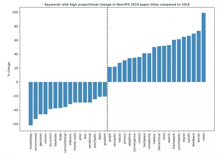 让我们从更宏观的角度看看本届 NeurIPS 大会上的论文都与什么主题相关。首先,我使用 Vennclods 将 1,011 份 NeurIPS 2018 的论文和 1,428 份 NeurIPS 2019 的论文的标题进行了可视化。中间黑色的部分是在这两年都十分常见的论文关键词的列表。 接着,如下图所示,我计算出了这些关键词从 2018 年到 2019 年的百分比变化。例如,如果在2018年,所有被接收的论文中有 1% 包含关键词「X」,而在2019年,这个数字是 2% ,那么这一比例的变化是(2-1) / 1=100% 。在下图中,我将绝对比例变化在 20% 以上的关键词绘制了出来。