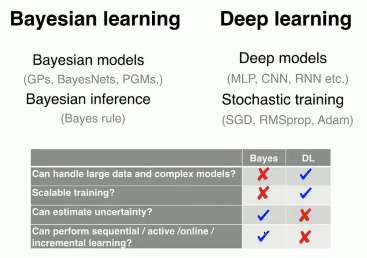 在今年的 NeurIPS 上,研究者们提出了一系列新颖的方法,而不仅仅是在别人的工作上叠加新的网络层。新提出的研究深度学习的方法中,我感兴趣的三个方向是:贝叶斯学习、图神经网络以及凸优化。正如 Emtiyaz Khan 在他的演讲「Deep Learning with Bayesian Principles」中所强调的,贝叶斯学习和深度学习是有很大的而区别。根据 Khan 的说法,深度学习使用的是一种「试错」的方法,我们通过实验看看会得到什么结果,然而贝叶斯原理迫使你事先考虑一个假设(先验)。与常规的深度学习相比,贝叶斯深度学习有两个主要的优势:非确定性估计以及在小数据集上更好的泛化性能。