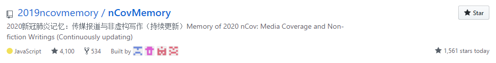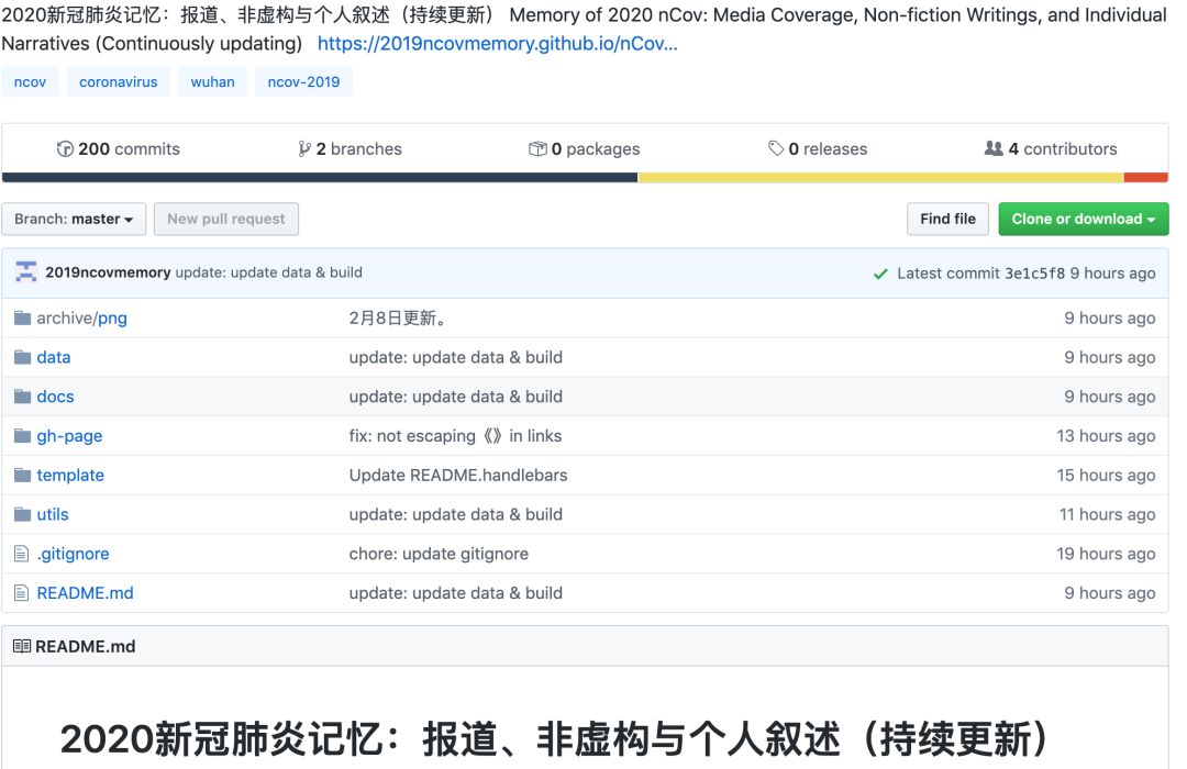 项目名叫 nCovMemory,上线几天,已经有了超过 4000 星标,超过 500 Folk。值得一提的是,在这个项目中,你看不到代码,参与者们共同维护的,是一个个从疫情开始到现在不断更新的新闻报道链接。https://github.com/2019ncovmemory/nCovMemory这个项目收录了 2020 年新型冠状病毒感染的肺炎(2019-nCoV)深度报道和非虚构作品的地址、截图、存档。