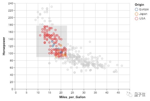 除了绘制基本图像,Altair强大之处在于用户可以与图像进行交互,包括平移、缩放、选中某一块数据等操作。在绘制图片的代码后面,调用interactive()模块,就能实现平移、缩放:Altair还为创建交互式图像提供了一个selection的API: