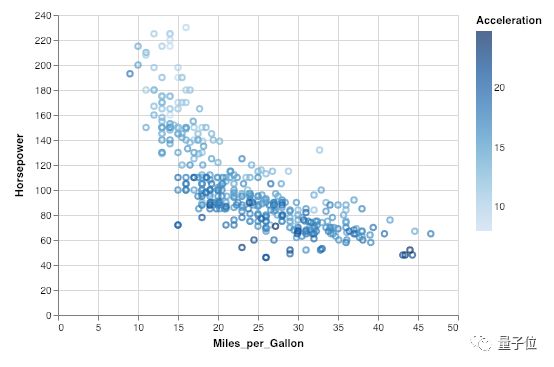 使用颜色刻度表,我们还能实现对连续变量的上色,比如在上图中加入“加速度”维度,颜色越深表示加速度越大:alt.Chart(cars).mark_point().encode(