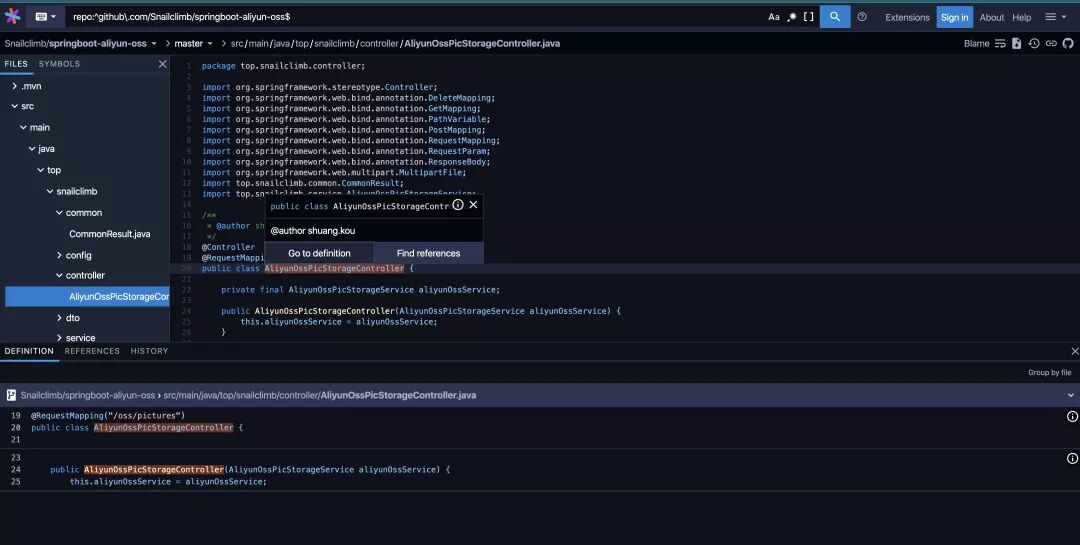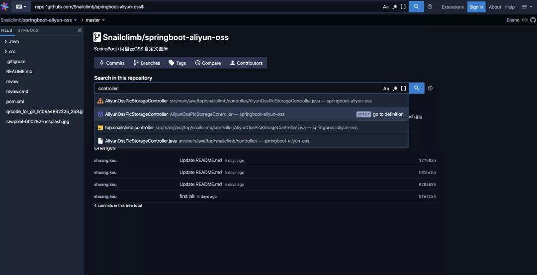 树形结构展示代码还支持类之间的跳转简单演示一下 SourceGraph 的代码搜索功能, 比如我想查找项目中的 Controller 的话,我可以这样写: