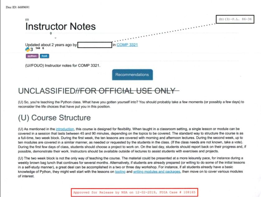 软件工程师 Chris Swenson 根据信息自由法案递交申请,要求访问 NSA 的 Python 培训材料,结果收到了 400 页经过编辑的 NSA COMP 3321 Python 培训课程打印资料。Swenson 扫描了打印稿,用 OCR 进行识别,确保数字档案可搜索,将其托管在 Digital Oceans Spaces,之后又被上传到了互联网档案馆。