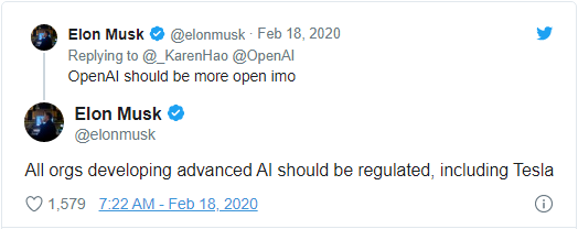 身为特斯拉和 SpaceX 两家高科技企业的高管,伊隆·马斯克再次发出了针对人工智能发展的警告。在周一晚上发布的推文中,其表示所有开发先进型人工智能的组织都应该受到监管,连自家的特斯拉也不能例外。显然,这是其对于麻省理工科技评论(MIT Tech Review)就 OpenAI 这家组织发表的有关看法的一个回应。