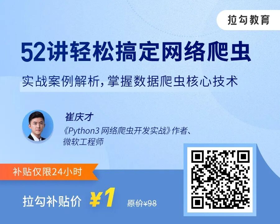 为了解决这样的问题,他和拉勾旗下的拉勾教育,联合推出了一门适合“新时代”的爬虫实战专栏「52讲轻松搞定网络爬虫」。