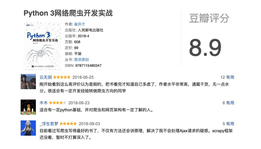 如何保护自家数据?如何爬取别人家的数据?成为各家数据工程师的矛和盾,也让爬虫与反爬虫技术这几年飞速发展。 我看到很多有 Python 基础的人,都会选择先学个爬虫,让自己辛苦所学,得以实践。但发现自己根本爬取不到对方软件的数据?能爬到的只有一些小站点,并无卵用。 为什么会这样?我们在各种网站上,可以看到各种爬虫课程和书籍。因为很多爬虫的课都是比较早期的技术点,中大型网站和 App 的反爬虫技术早就经历了大规模的更新迭代。你学着“上个时代”的爬虫技术,爬取“新时代”的程序,难度可想而知。有一本书叫《 Python 3 网络爬虫开发实战 》豆瓣评分 8.9,更是 6w+ 爬虫工程师的启蒙教材。这本超级畅销书的作者崔庆才,从 2015 年研究爬虫技术,在研究过程中在博客上记录和分享了自己的爬虫心得,颇受读者好评,到现在博客阅读量已经过千万。同时,他还是微软的工程师。