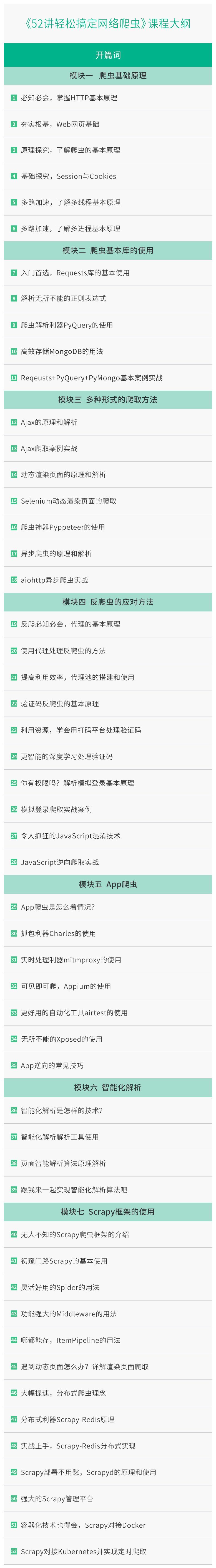 为了解决这样的问题,他和拉勾旗下的拉勾教育,联合推出了一门适合“新时代”的爬虫实战专栏「 52讲轻松搞定网络爬虫 」。这个专栏把他这本畅销书的知识点做了精简,选择那些你必须要学且学了就能用的知识点,结合当下的技术情况新增了很多关键内容,比如「 JavaScript 逆向 」「 App 逆向解密 」「 深度学习识别验证码 」「 网页的智能解析 」「 异步爬取 」。这些内容,你在市面上很难找到相应的学习资料的内容!