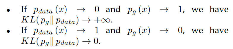 因此 E_(x~p_g)[-log(D*_G(x))] 等价于因此 E_(x~p_g)[log^(1 - D*_G(x))] 等价于从 (12) 式可以看出,对非饱和博弈中的替代 G 损失函数的优化是矛盾的,因为第一项目标是使生成的分布与实际分布之间的差异尽可能小,而由于负号的存在,第二项目标是使得这两个分布之间的差异尽可能大。这将为训练 G 带来不稳定的数值梯度。此外,KL 散度是非对称度量,这可以从以下两个例子中反映出来对 G 的两种误差的惩罚是完全不同的。第一种误差是 G 产生了不真实的样本,对应的惩罚很大。第二种误差是 G 未能产生真实的样本,而惩罚很小。第一种误差是生成的样本不准确,而第二种误差是生成的样本不够多样化。基于这个原理,G 倾向于生成重复但是安全的样本,而不愿意冒险生成不同但不安全的样本,这会导致模式坍塌(mode collapse)问题。