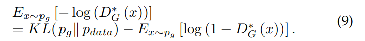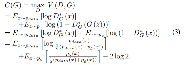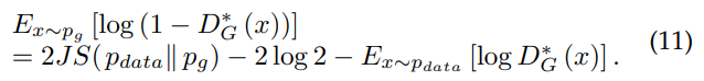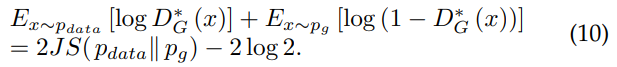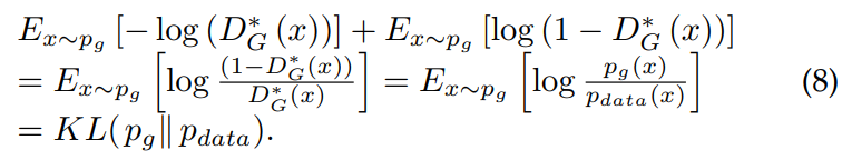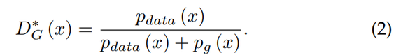 其中 D(x) 是 [1, 0]^T 和 [D(x), 1 - D(x)]^T 间的交叉熵。类似地,log(1-D(G(z))) 是 [0, 1]^T 和 [D(G(z)), 1 - D(G(z))]^T 间的交叉熵。对于一个固定的 G,[3] 中给出了最优的判别器 D: