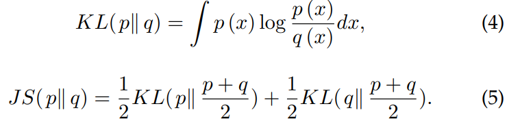 两个概率分布 p(x) 和 q(x) 之间的 KL 散度和 JS 散度定义如下:因此,GAN 的目标函数和 KL 散度与 JS 散度都相关。