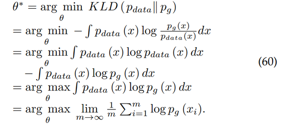 GAN 已被用于特征学习领域,例如特征选择 [277],哈希 [278]-[285] 和度量学习 [286]。MisGAN [287] 可以通过 GAN 利用不完整数据进行学习。[288] 中提出了进化型 GAN(Evolutionary GAN)。Ponce 等人 [289] 结合 GAN 和遗传算法为视觉神经元演化图像。GAN 还被用于其它机器学习任务 [290],例如主动学习 [291],[292],在线学习 [293],集成学习 [294],零样本学习 [295],[296] 和多任务学习 [297]。并不是所有生成模型都使用 MLE。一些生成模型不使用 MLE,但可以被修改为使用 MLE(GAN 就属于此类)。可以简单地证明,最小化 p_data(x) 和 p_g(x) 之间的 KL 散度(KLD)等价于最大化样本数 m 增加时的对数似然:为了保证符号一致性,将模型概率分布 p_θ(x)替换为 p_g(x)。有关 MLE 和其他统计估计量的更多信息,请参阅 [298] 的第 5 章。GAN 很难训练,并且在 [26],[29] 已经观察到它们经常受到模式坍塌 [299],[300] 的影响,其中生成器学习到仅仅根据少数几种数据分布模式生成样本,而忽视了许多其它的模式(即使整个训练数据中都存在来自缺失模式的样本)。在最坏的情况下,生成器仅生成单个样本(完全坍塌)[179],[301]。在本小节中,我们首先引入 GAN 模式坍塌的两种观点:散度观点和算法观点。然后,我们将介绍通过提出新的目标函数或新的架构以解决模式坍塌的方法,包括基于目标函数的方法和基于架构的方法。