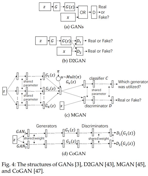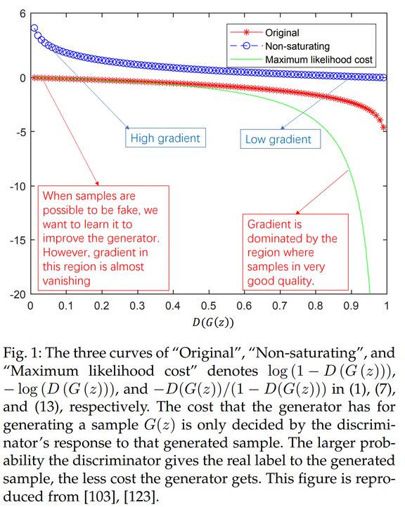 在 GAN 中,有许多方法可以近似 (1) 式。假设判别器是最优的,我们想最小化在 GAN 框架中有其它可能的方法逼近最大似然 [17]。图 1 展示了对于原始零和博弈、非饱和博弈以及最大似然博弈的比较。首先,当样本可能来自于生成器的时候,即在图的左端,最大似然博弈和原始极大极小博弈都受到梯度弥散的影响,而启发式的非饱和博弈不存在此问题。第二,最大似然博弈还存在一个问题,即几乎所有梯度都来自曲线的右端,这意味着每个 minibatch 中只有极少一部分样本主导了梯度的计算。这表明减小样本方差的方法可能是提高基于最大似然博弈的 GAN 性能的重要研究方向。第三,基于启发式的非饱和博弈的样本方差较低,这可能是它在实际应用中更成功的可能原因。M.Kahng 等人 [124] 提出了 GAN Lab,为非专业人士学习 GAN 和做实验提供了交互式可视化工具。Bau 等人 [125] 提出了一个分析框架来可视化和理解 GAN。与 GAN [126]-[131] 相关的论文有很多,例如 CSGAN [132] 和 LOGAN [133]。在本小节中,我们将介绍一些具有代表性 GAN 变体。