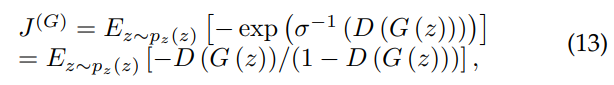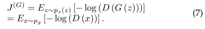 实际上,公式 (1) 可能无法为 G 提供足够大的梯度使其很好地学习。一般来说,G 在学习过程的早期性能很差,产生的样本与训练数据有明显的差异。因此,D 可以以高置信度拒绝 G 生成的样本。在这种情况下,log(1-D(G(z))) 是饱和的。我们可以训练 G 以最大化 log(D(G(z))),而非最小化 log(1-D(G(z)))。生成器的损失则变为这个新的目标函数可以在训练过程中使 D 和 G 的达到相同的不动点,但是在学习初期就提供了大得多的梯度。非饱和博弈是启发式的,而非理论驱动的。然而,非饱和博弈还存在其它问题,如用于训练 G 的数值梯度不稳定。在最优的 D*_G 下,有