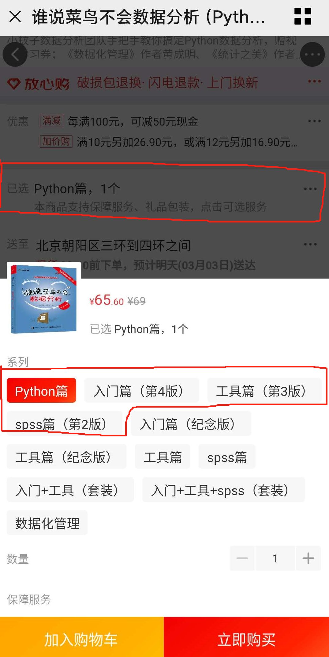 直接点击【阅读原文】进入京东选购,进入后点开【已选】,可以选择 入门篇、工具篇、SPSS篇、Python篇