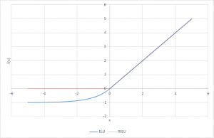 ELU函数对于x大于0的值的导数是1,就像所有ReLU变体一样。但对于x<0的值,导数是a.e ^x 。f'(x) = x, x>=0 = a(e^x), x<0
