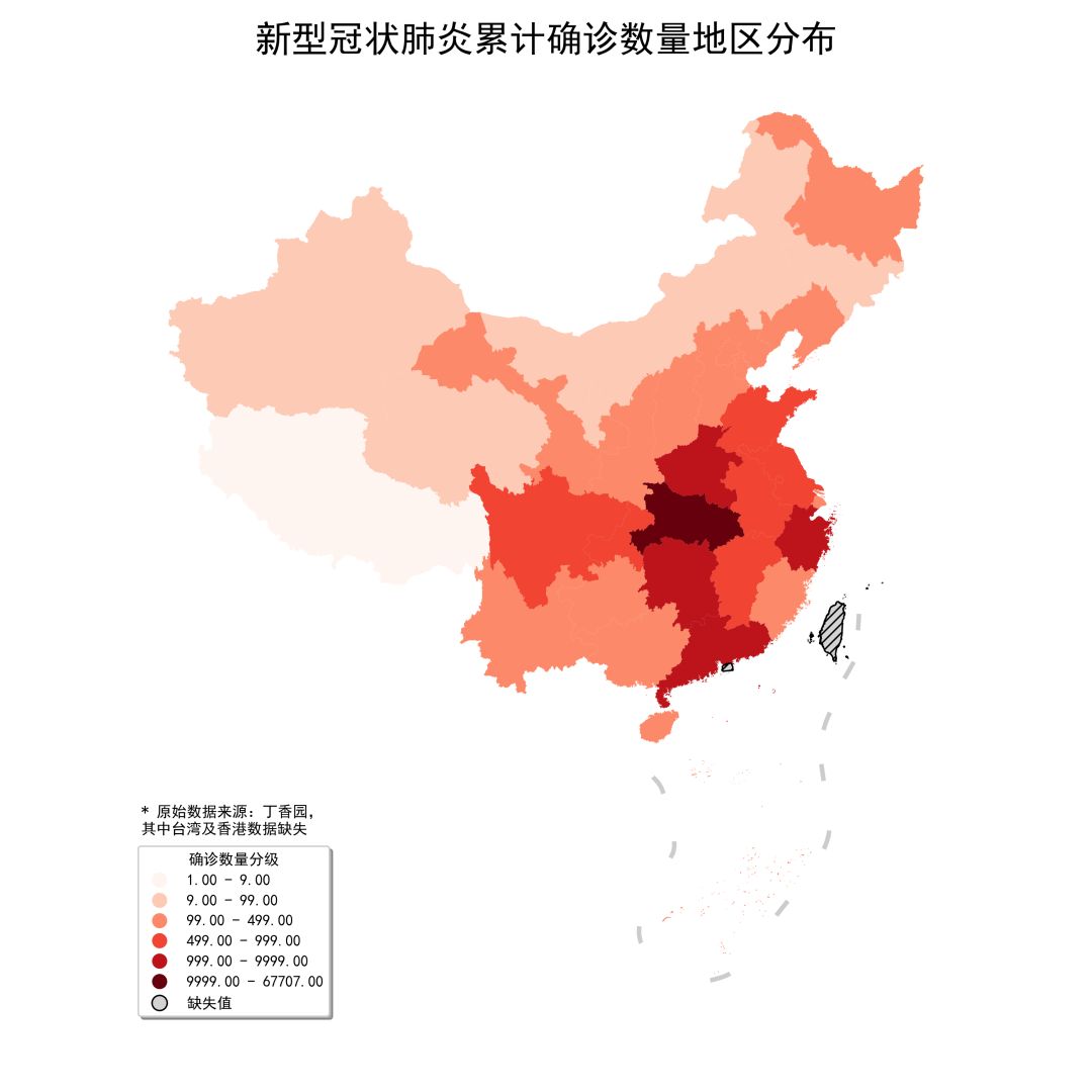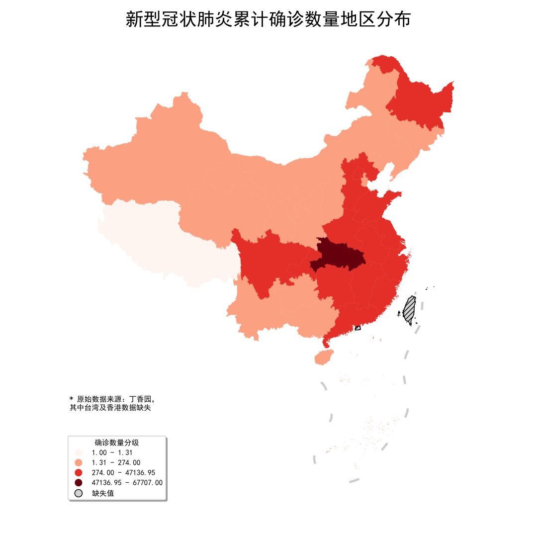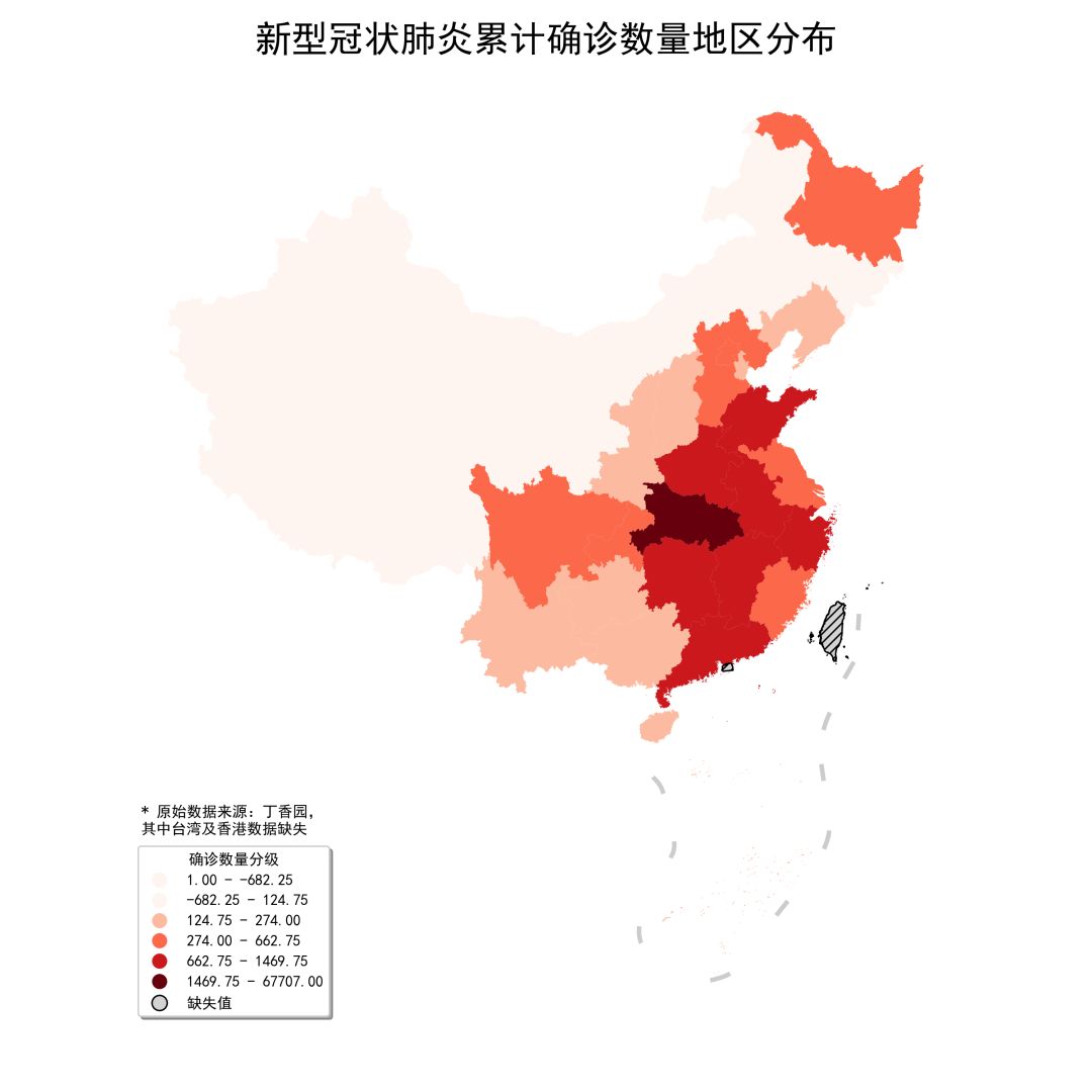 用JenksCaspall数据分层出来的结果,无论数据分布如何,每个分层内部的数据个数都较为均匀,下面我们用JenksCaspall来划分省份疫情严重情况: