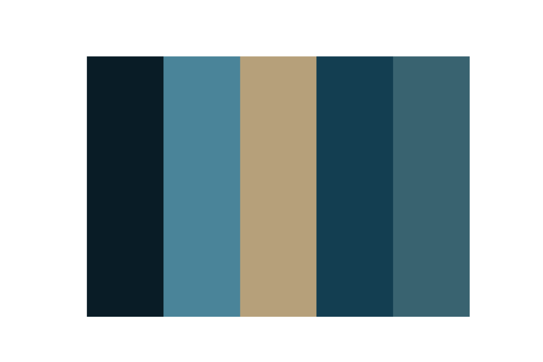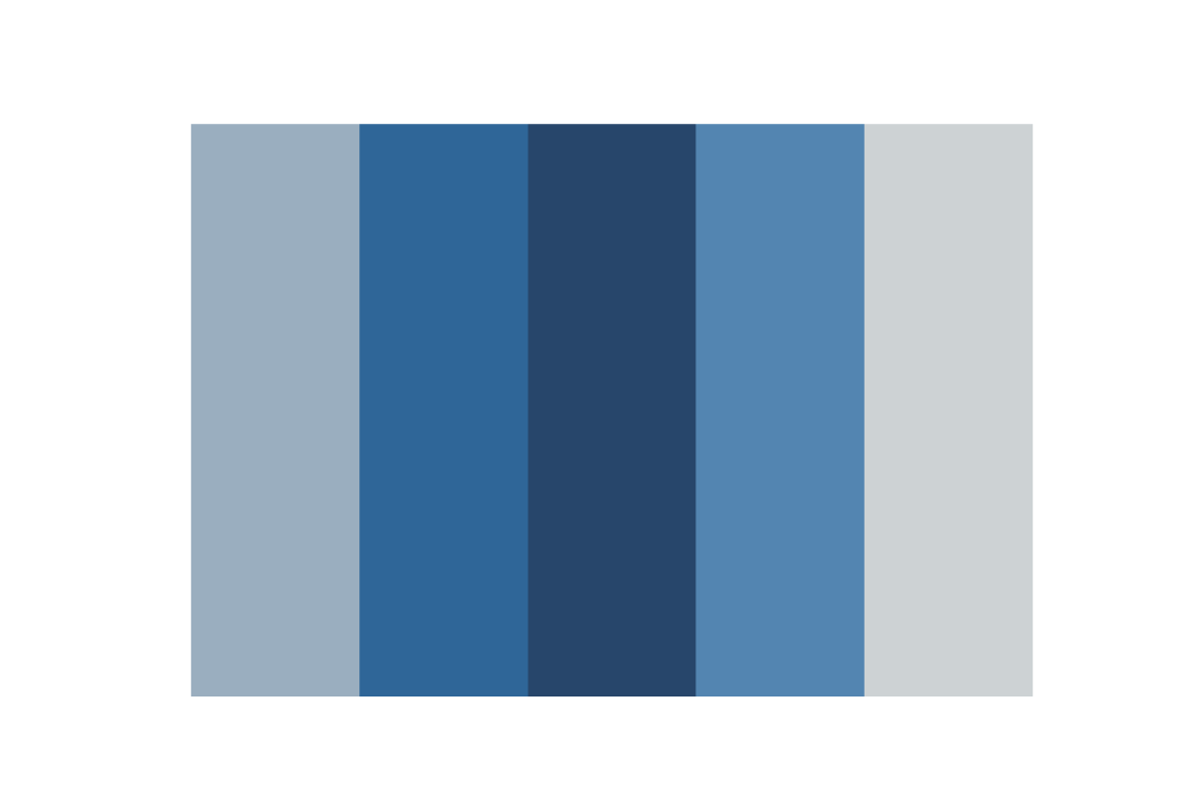 from sklearn.cluster import KMeans# 构建特征 rgb = pd.DataFrame([sea[x][y] for x in range(sea.shape[0 ]) for y in range(sea.shape[1 ])], columns=['r' , 'g' , 'b' ])# k-means聚类,其中n_clusters表示聚类数量,n_jobs=-1表示开启所有核心并行运算 model = KMeans(n_clusters=5 , n_jobs=-1 ) model.fit(rgb) # 训练模型 # 提取聚类簇重心,即我们需要的主色,绘制调色板 plt.bar([i for i in range(model.cluster_centers_.__len__())], height=[1 for i in range(model.cluster_centers_.__len__())], color=[tuple(c) for c in (model.cluster_centers_ / 255. )], width=1 ) plt.axis('off' )