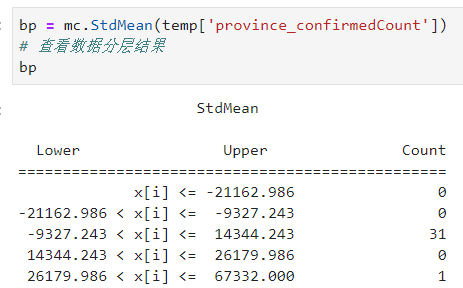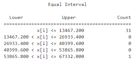 bp = mc.EqualInterval(temp['province_confirmedCount' ])# 查看数据分层结果 bp图8 可以看到对于分布非常不均匀的新冠肺炎确诊数量数据来说,这种方法表现得十分糟糕,中间三个类都没有记录落入。