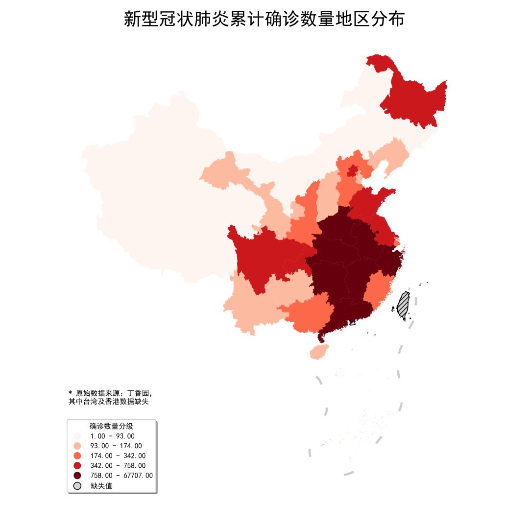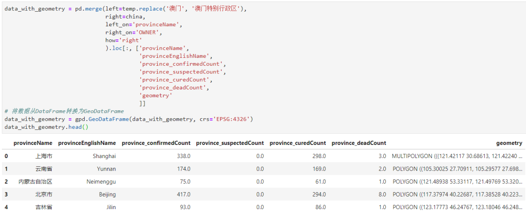 下面我们配合geopandas来对上述结果进行可视化,和上一篇文章一样,按照省级单位名称连接我们的疫情数据与矢量数据: