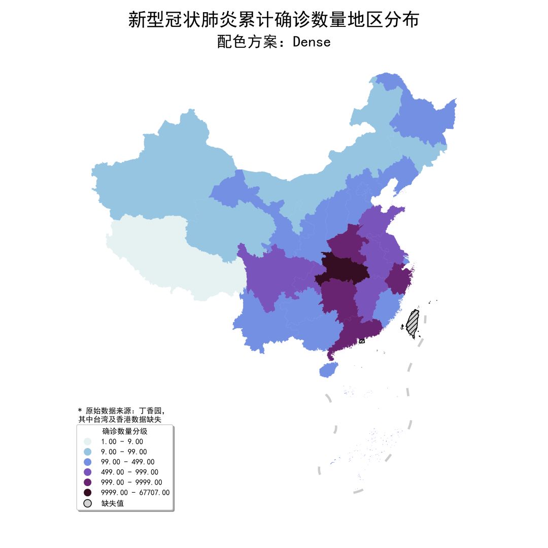 alpha=0.4 ) ax.axis('off' ) plt.suptitle('新型冠状肺炎累计确诊数量地区分布' , fontsize=24 ) # 添加最高级别标题 plt.tight_layout(pad=4.5 ) # 调整不同标题之间间距 ax.text(-2800000 , 1300000 , '* 原始数据来源:丁香园,\n其中台湾及香港数据缺失' ) # 添加数据说明 fig.savefig('图24.png' , dpi=300 )图24 2.2 色彩方案的选择 前面已经详细介绍了数据分层常用的各种方法及使用场景,“分层”的部分做完之后,就到了设色的部分。