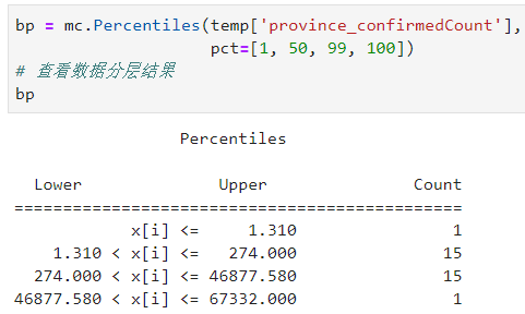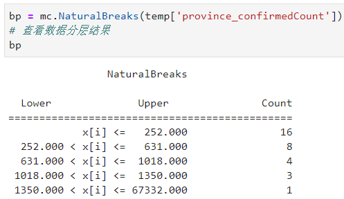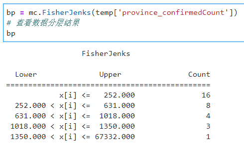 import mapclassify as mc# 对各省2020-03-08对应的累计确诊数量进行分层 bp = mc.BoxPlot(temp['province_confirmedCount' ])# 查看数据分层结果 bp