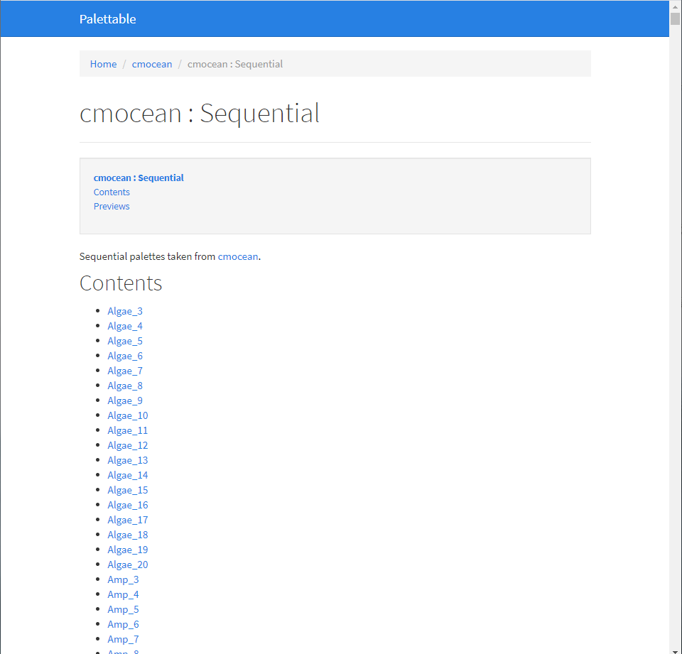 譬如如果我们想要使用palettable.cmocean.sequential中的色彩,其中cmocean表示色彩来源,sequential表示连续型色彩,就可以先在对应的示例网页 [6] 下查看所有方案: