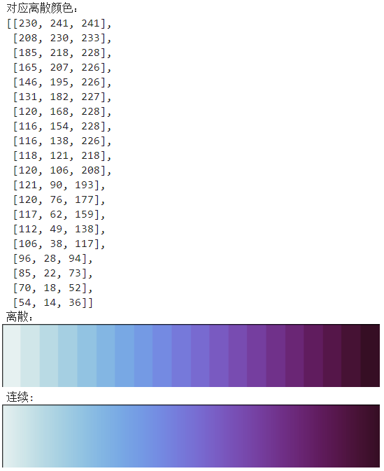 譬如我们导入Dense_20,20表示其自带的离散色彩数量,并查看其自带的离散色彩RGB值、离散色盘以及连续色盘示例: