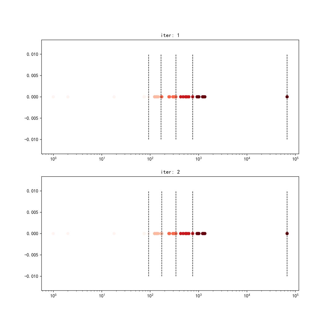 再将每个分层中数据的最大值作为间断点,下面我们从mapclassify源代码中抽出该部分代码,对其迭代过程可视化。