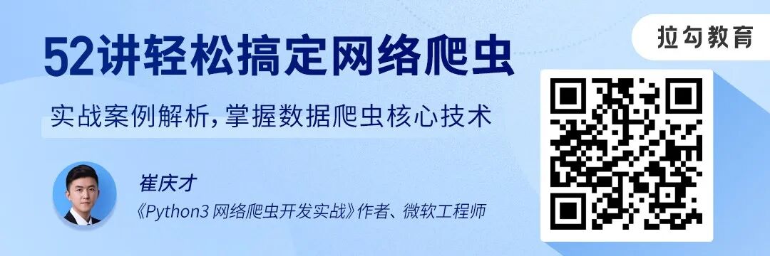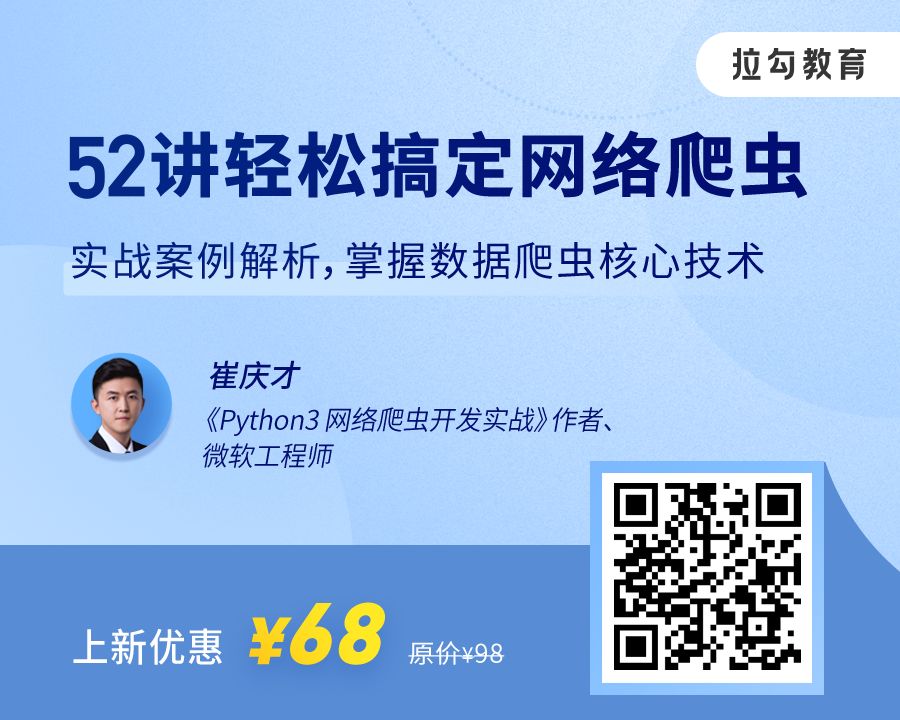 为了解决这样的问题,他和拉勾旗下的拉勾教育,联合推出了一门适合“新时代”的爬虫实战专栏「 52讲轻松搞定网络爬虫 」。这个专栏把他这本畅销书的知识点做了精简,选择那些你必须要学且学了就能用的知识点,结合当下的技术情况新增了很多关键内容,比如「 JavaScript 逆向 」「 App 逆向解密 」「 深度学习识别验证码 」「 网页的智能解析 」「 异步爬取 」。这些内容,你在市面上很难找到相应的学习资料的内容!